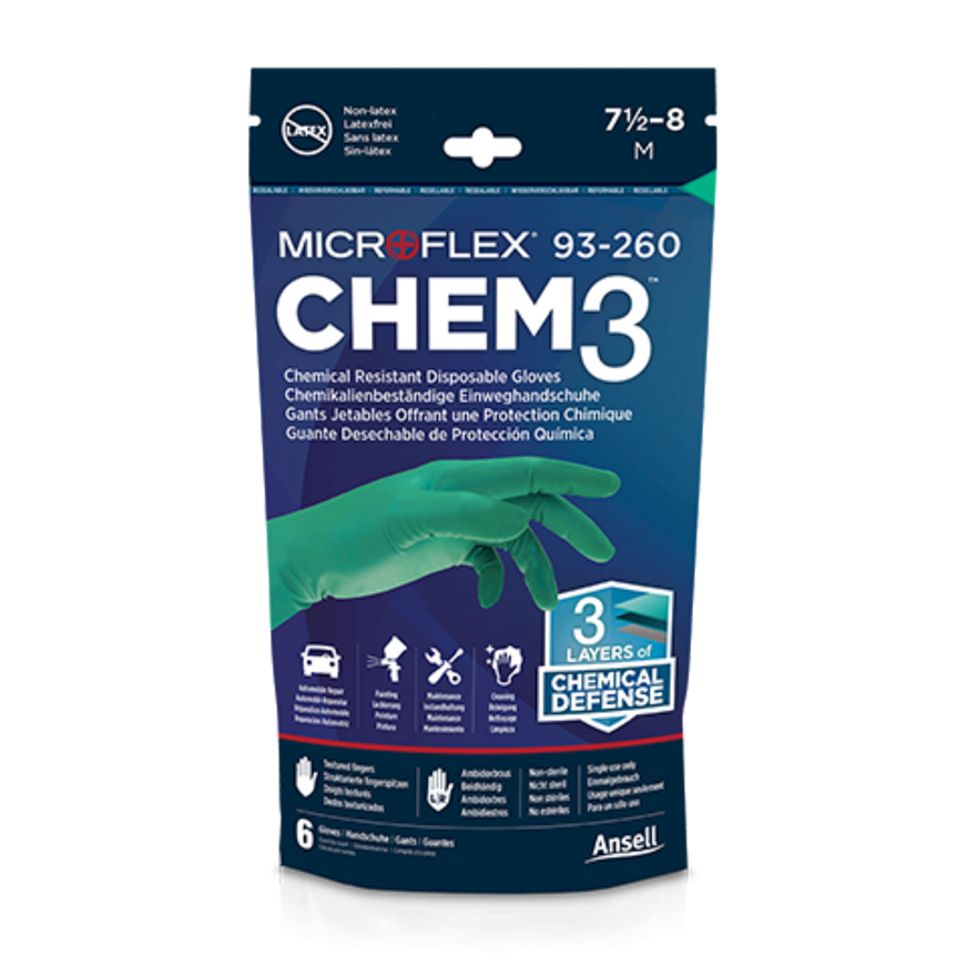 Guantes desechables resistentes a químicos que ofrecen una resistente protección y comodidad incomparable. Estos son delgados, desechables y resistentes a químicos. Ofrecen niveles más altos de protección contra químicos durante períodos más largos de tiempo que los guantes normales de un solo uso. Con un grosor de sólo 7.8 mils, estos guantes de nitrilo y neopreno delgados, ofrecen esta protección superior y al mismo tiempo sensibilidad táctil mejorada y destreza para fácil manejo de piezas y herramientas pequeñas.
