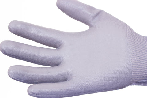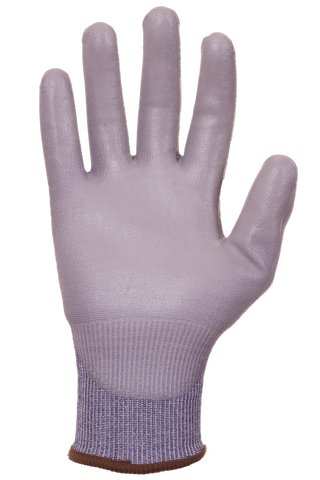 Base textil de HPPE ultra delgado calibre 18 resistente al corte EN388 nivel 5/D color azul con recubrimiento en palma de poliuretano con acabado espuma color gris.