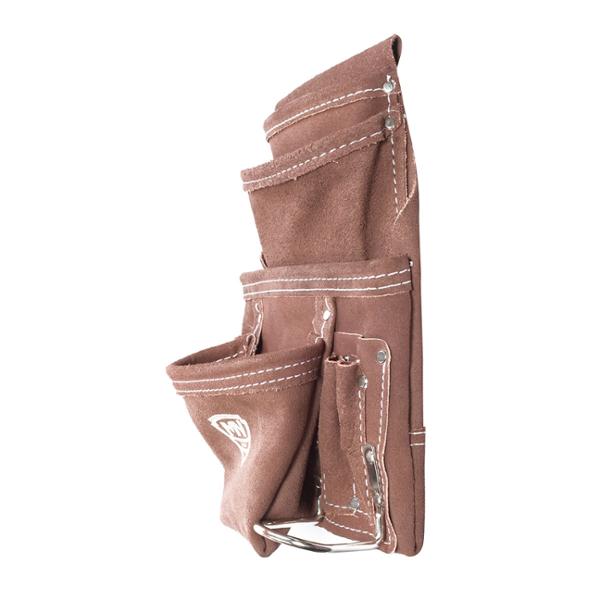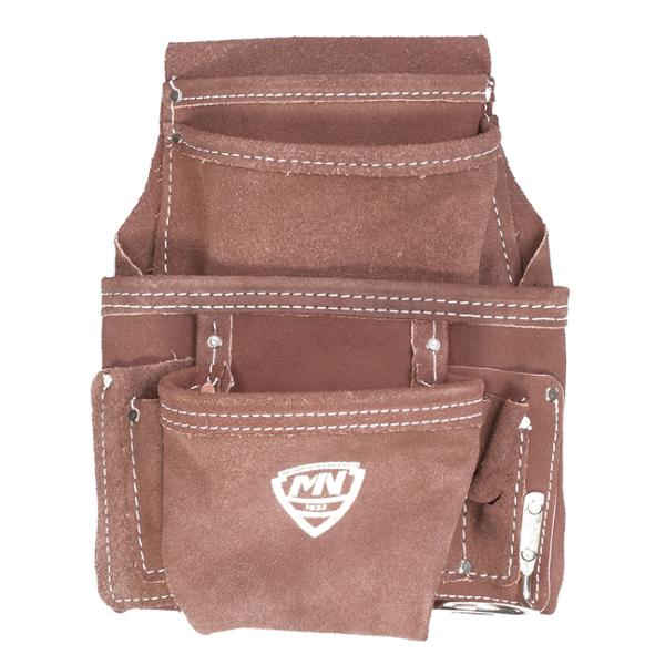 Porta herramientas de carnaza con esquinas reforzadas, útil para sujetar las herramientas de mano, con 10 compartimientos remachados y un porta martillo de metal, que facilitan la organización de las piezas.