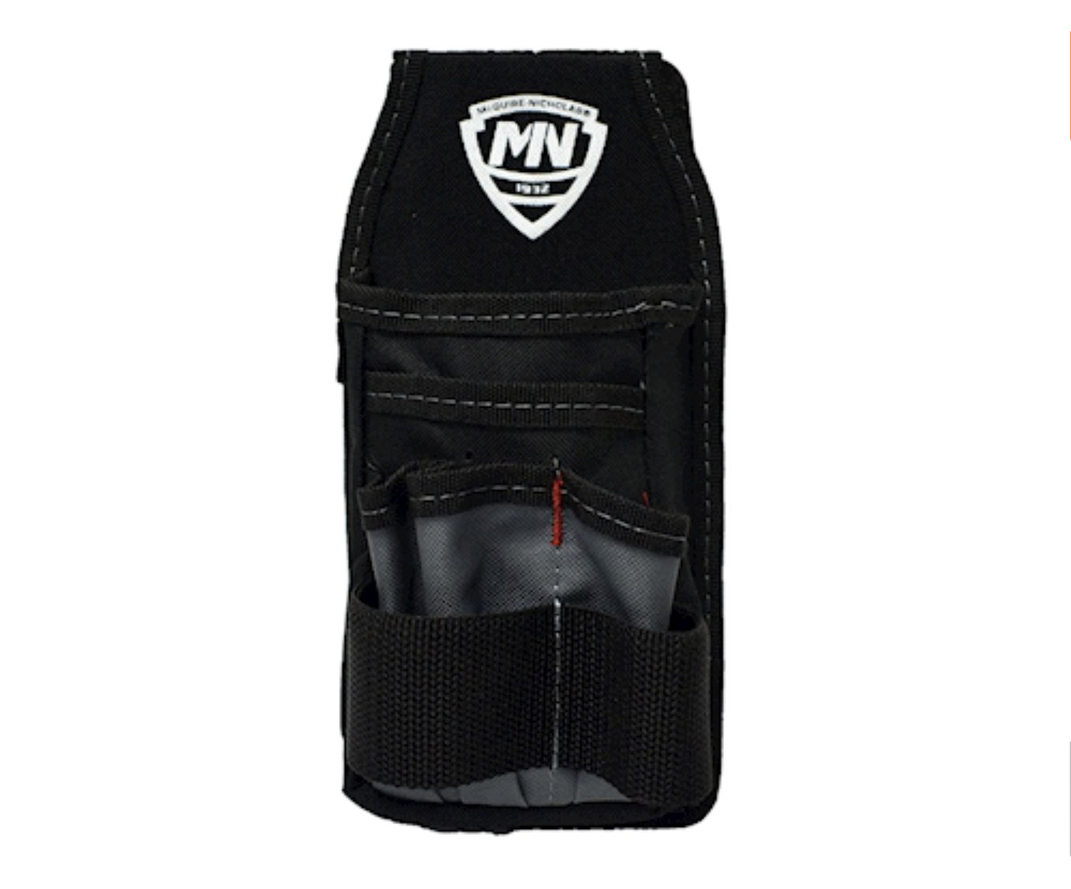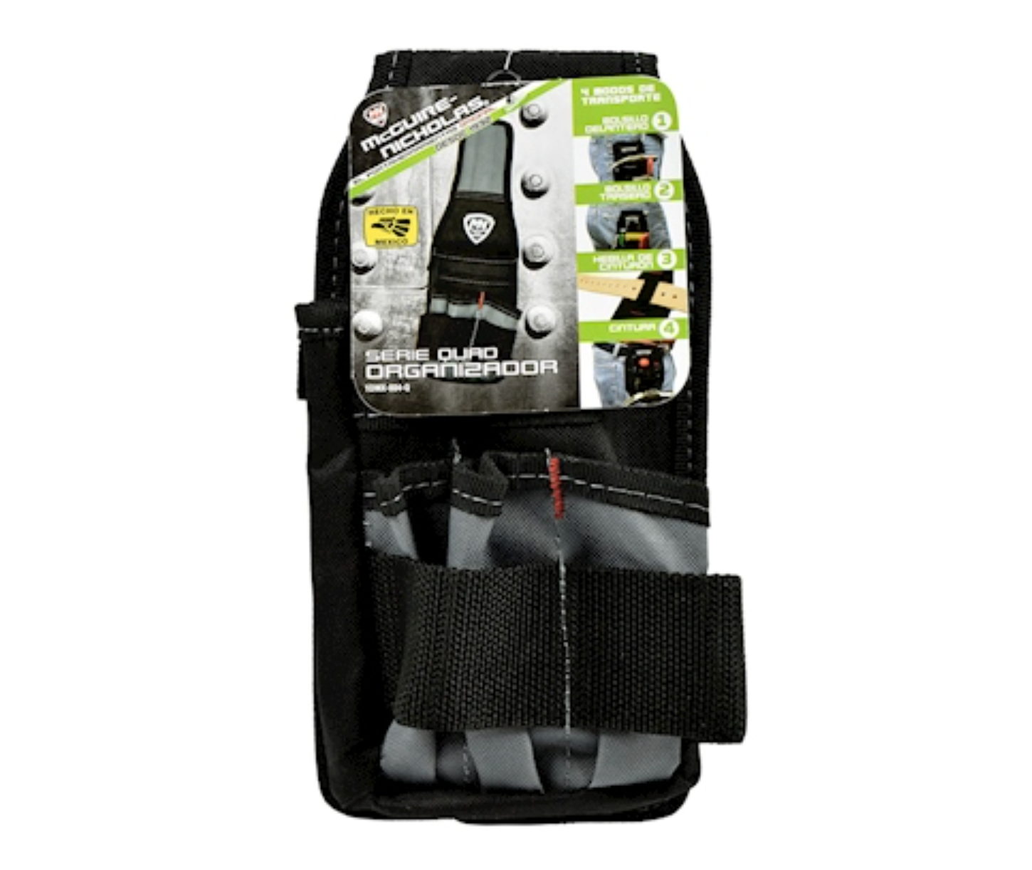 Porta herramientas de la marca McGuire-Nicholas; Incluye 5 paquetes frontales para accesorios o herramientas con pasa cinto, cuneta con frente rígido apto para herramientas medianas y sistema de fácil acomodo.