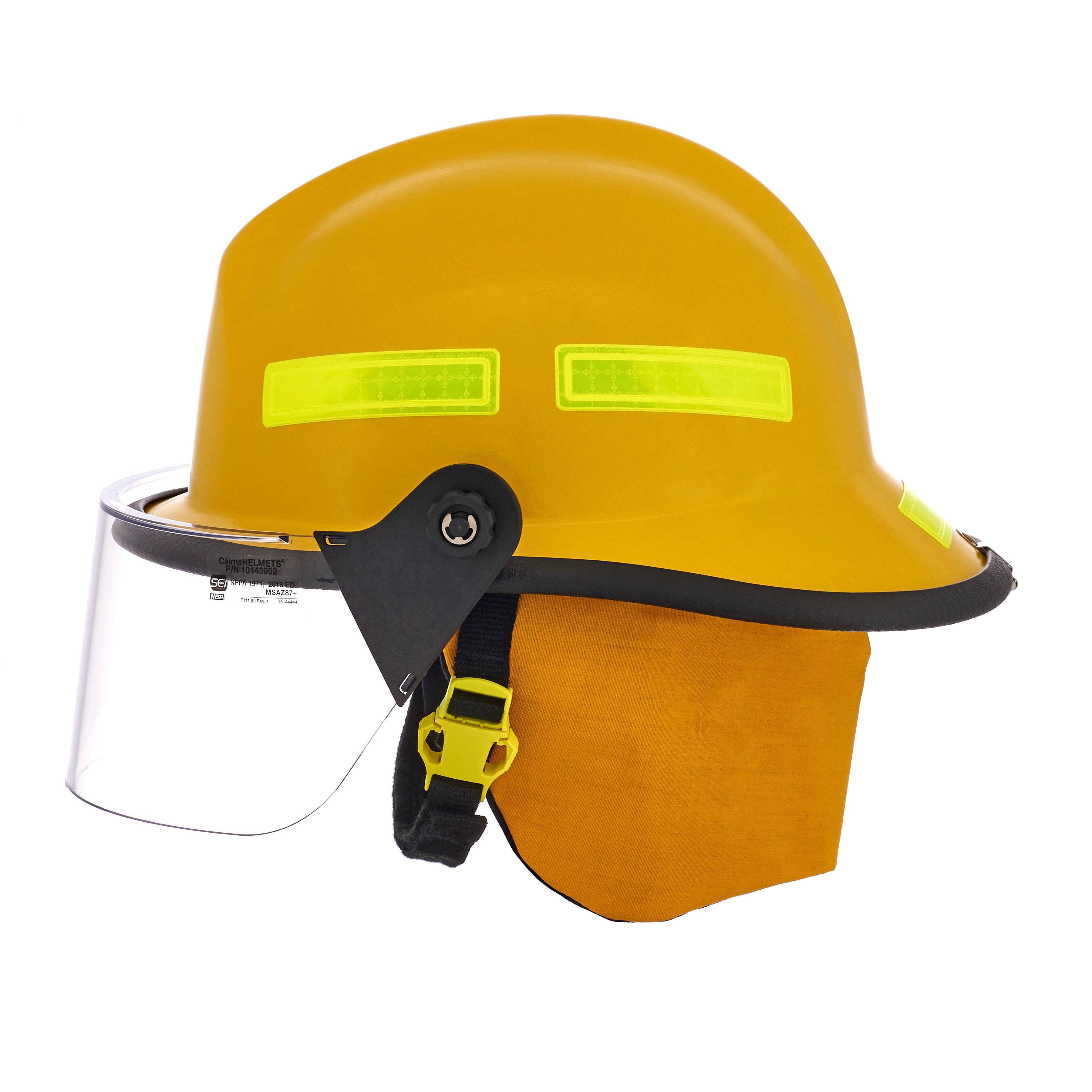 Color Amarillo. Configuración: visor Tuffshield facial 4”, franela acojinada, protector para orejas Nomex, sistema liberador de concha y sistema absorbedor de impacto.